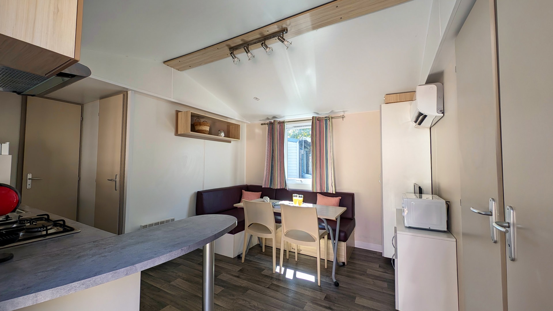 Ein Schlafzimmer mit 1 Doppelbett (140cm x 190cm), ein Schlafzimmer mit 2 Einzelbetten (70cm x 190cm), Sitzbank, die im Wohnzimmer in ein Doppelbett umgewandelt werden kann (130cm bestehend aus Kissen), Badezimmer, separates WC, Bettdecken + Kopfkissen, ausgestattete Küche, Mikrowelle, Kaffeemaschine mit Kapseln (Dolce Gusto), Essecke, Geschirr, Heizung, Terrasse, Gartenmöbel.