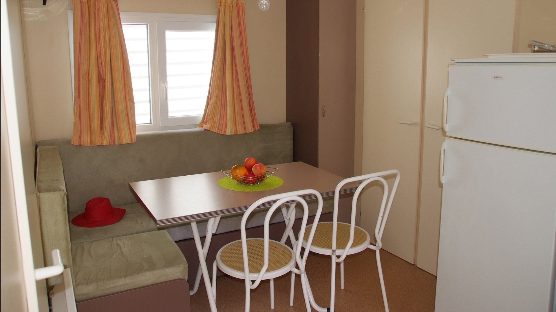 Ein Schlafzimmer mit 1 Doppelbett (140 cm x 190 cm), ein Schlafzimmer mit 2 Einzelbetten (70 cm x 190 cm), ein Schlafsofa im Wohnzimmer (130 cm x 190 cm, mit Kissen bezogen), Bettdecken + Kissen, Badezimmer mit Wasser, WC, Kühlschrank, ausgestattete Küche, Mikrowelle, Kapselkaffeemaschine (Dolce Gusto), Essbereich, Geschirr, Gartenmöbel.