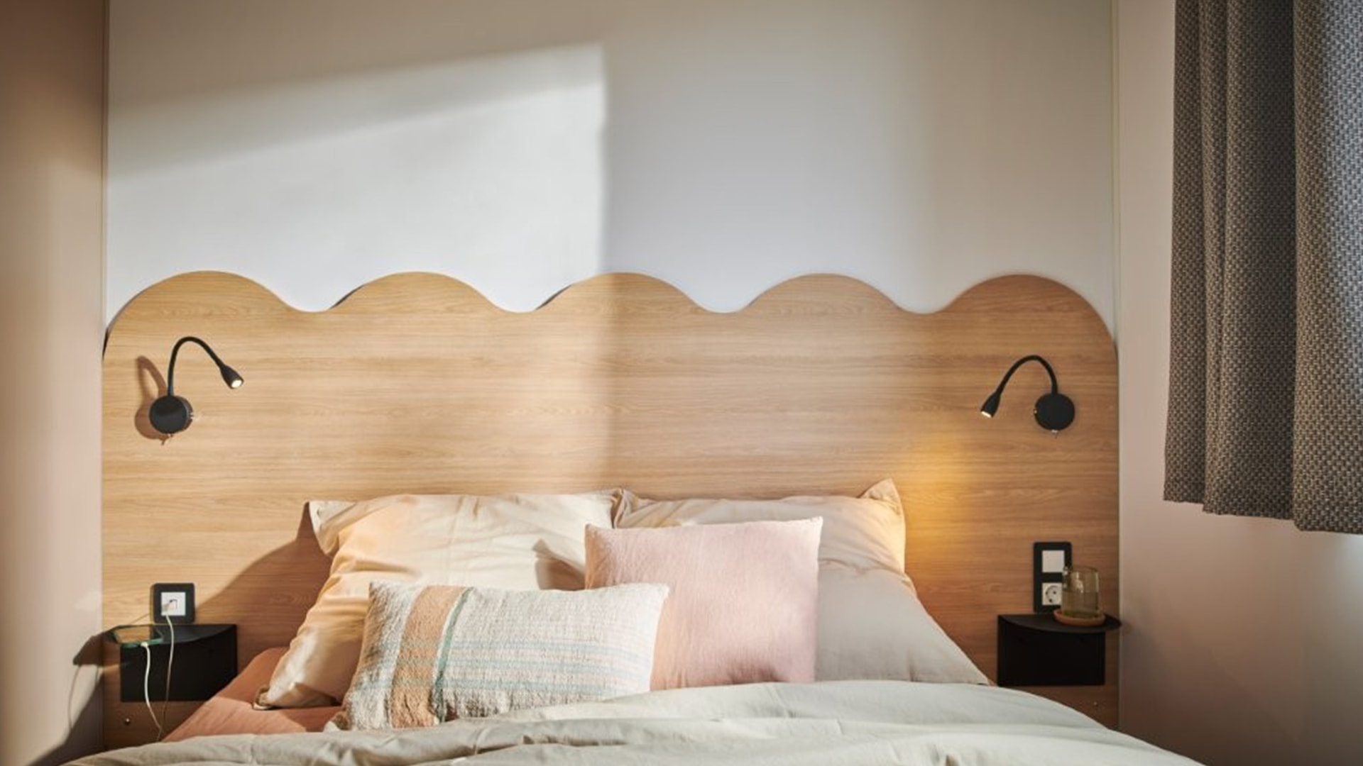 Ein Schlafzimmer mit einem Doppelbett (140 cm x 190 cm), ein Schlafzimmer mit zwei Einzelbetten (70 cm x 190 cm), Duschbad, separates WC, Bettdecken und Kissen, Kühlschrank, Geschirrspüler, Mikrowelle, Kapselkaffeemaschine (Dolce Gusto), Essbereich, Geschirr, Gartenmöbel. Elektrischer Grill erlaubt – nicht vorhanden.