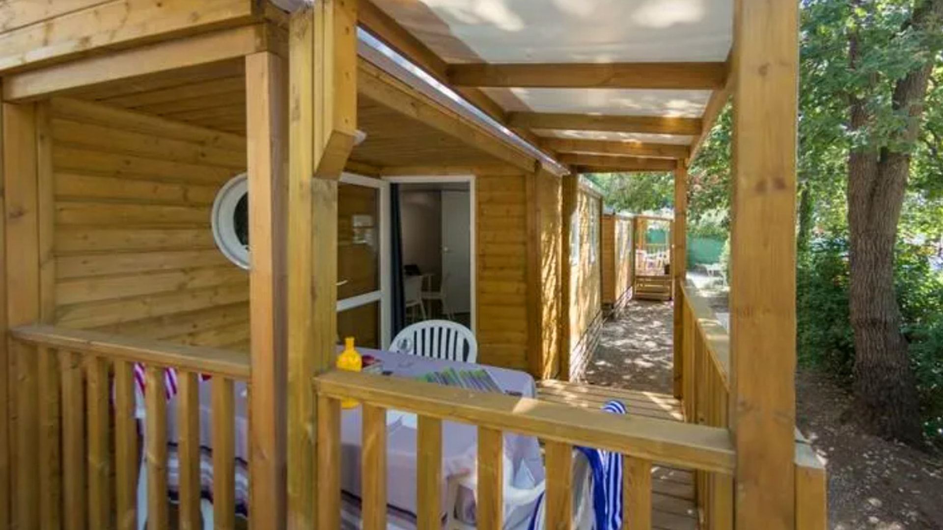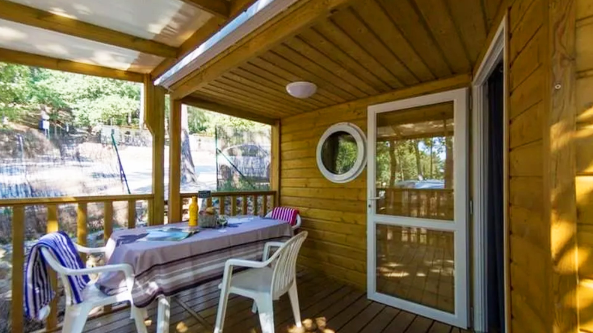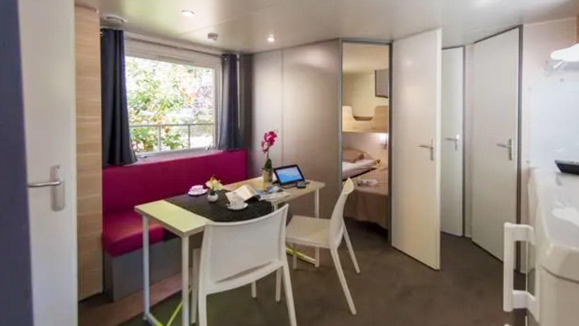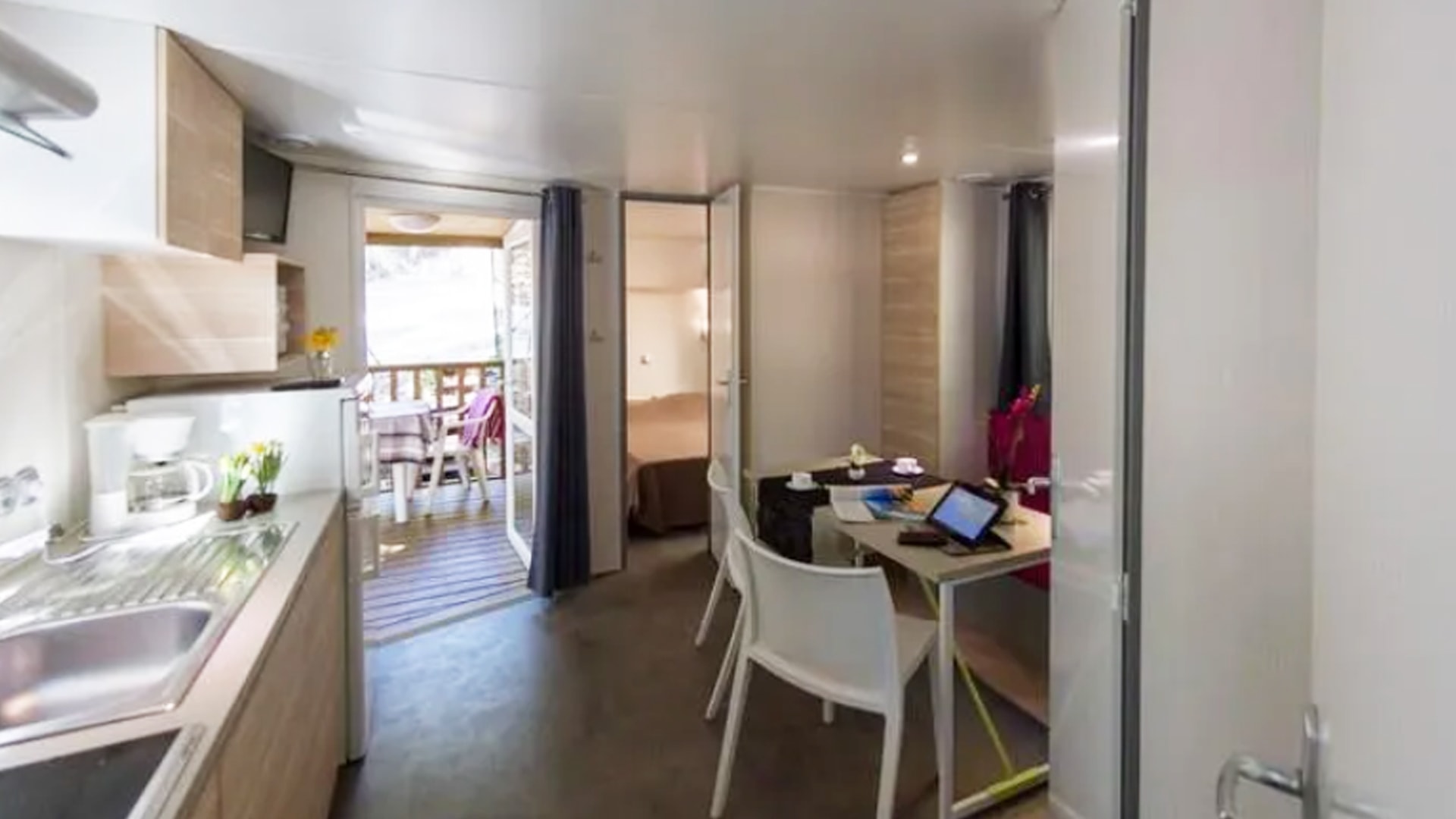 Une chambre avec 1 grand lit (140cm x 190cm), une chambre avec 2 lits simples (80cm x 190cm), salle d’eau, WC séparés, couettes et oreillers, cuisine équipée, réfrigérateur/ congélateur, micro-ondes, cafetière (Dolce Gusto), coin repas, vaisselle, chauffage, salon de jardin.