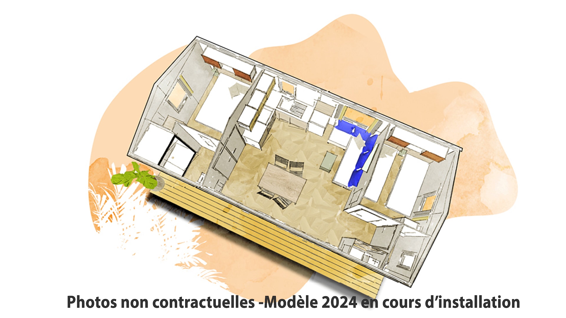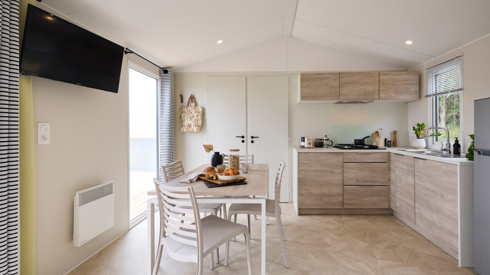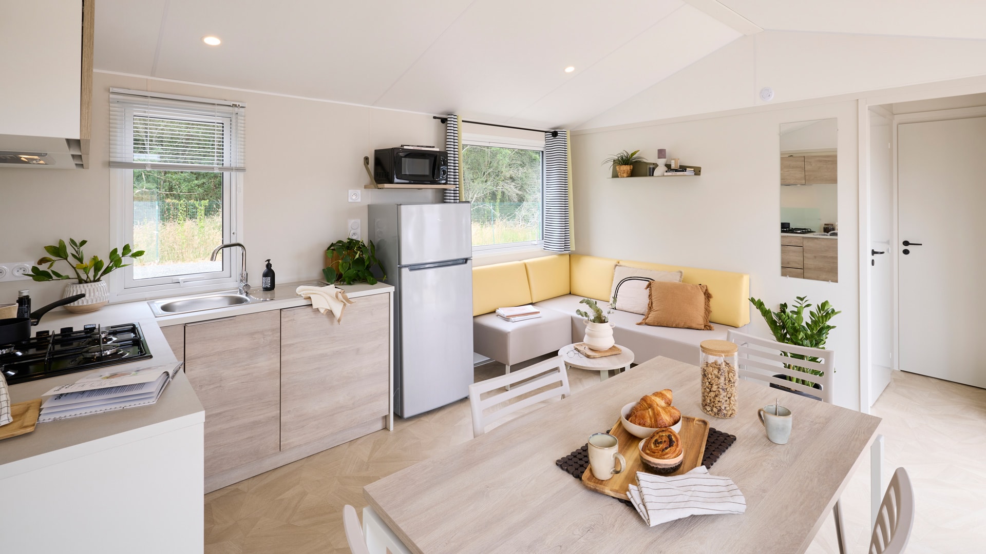 Une chambre avec 1 grand lit (140cm x 190cm), une chambre avec 2 lits simples (70cm x 190cm), salle d’eau, WC séparés, couettes et oreillers, cuisine équipée, grand réfrigérateur, micro-ondes, cafetière à capsules (Dolce Gusto), coin repas, vaisselle, chauffage, terrasse, salon de jardin.