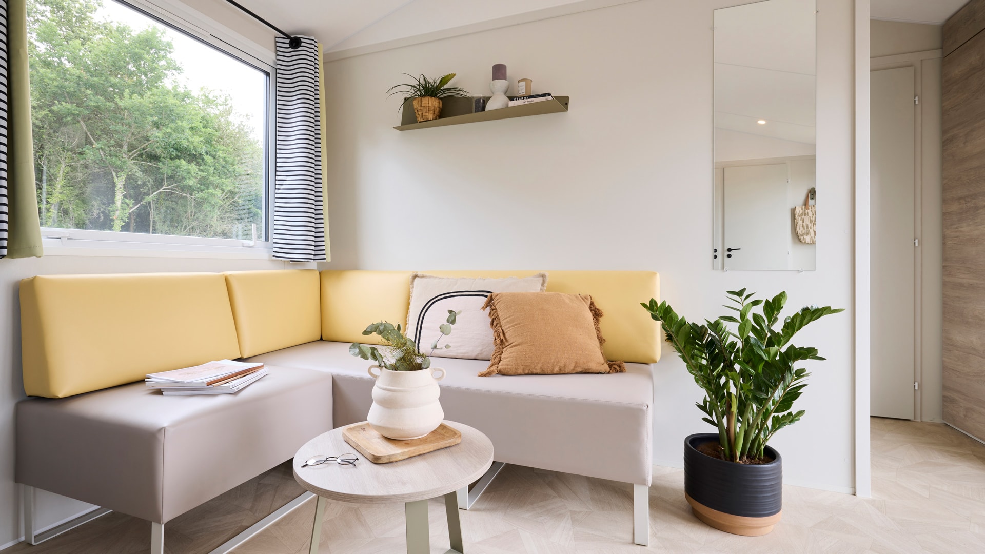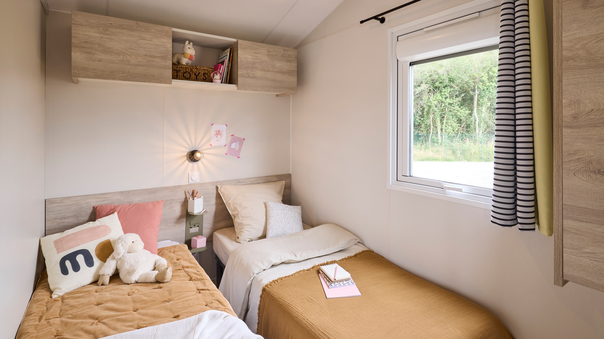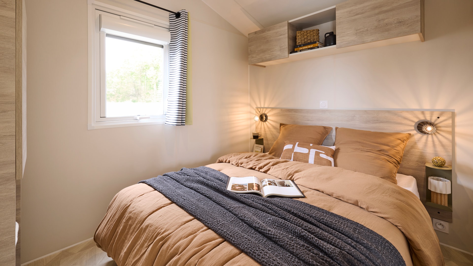 Une chambre avec 1 grand lit (140cm x 190cm), une chambre avec 2 lits simples (70cm x 190cm), salle d’eau, WC séparés, couettes et oreillers, cuisine équipée, grand réfrigérateur, micro-ondes, cafetière à capsules (Dolce Gusto), coin repas, vaisselle, chauffage, terrasse, salon de jardin.